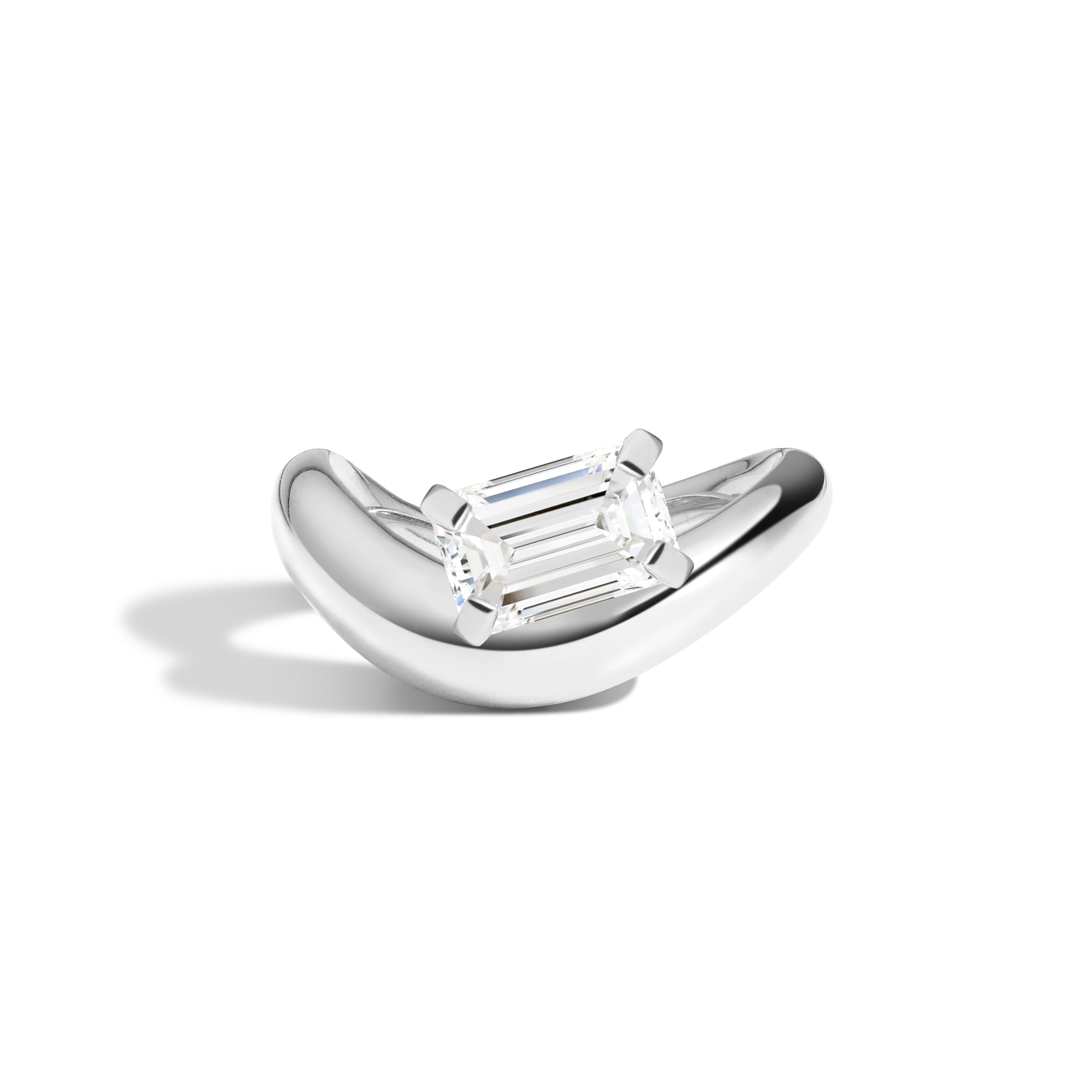 The cloud rings orchestrate a symphony of metaphysical beauty through their elegant contours and reflective surfaces, seamlessly harmonizing the worlds of art, architecture, and romance. A tab-set Emerald diamond rests cantilevered on the soft curves of a sculptural cloud band.