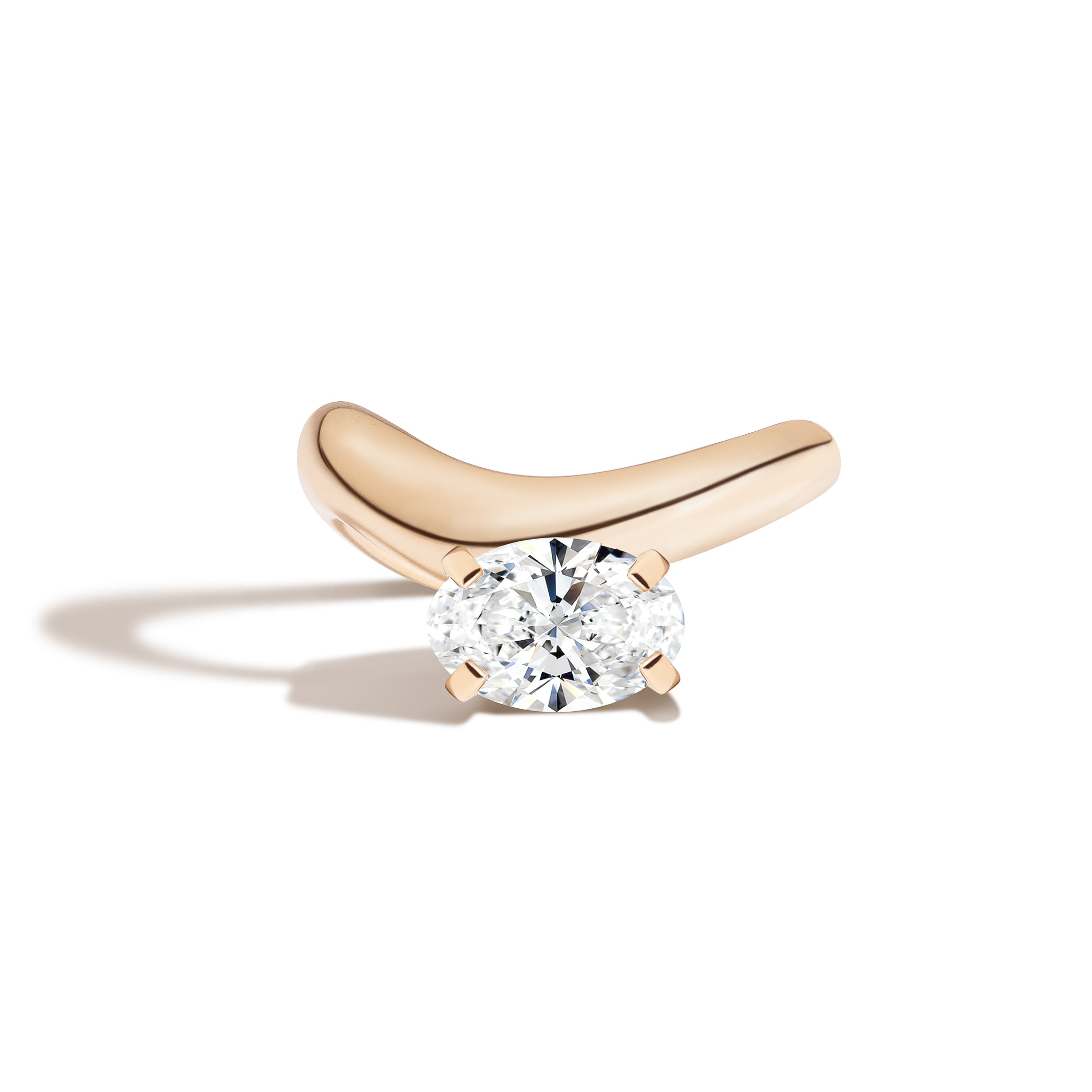 The cloud rings orchestrate a symphony of metaphysical beauty through their elegant contours and reflective surfaces, seamlessly harmonizing the worlds of art, architecture, and romance. A tab-set Oval diamond rests cantilevered on the soft curves of a sculptural cloud band.