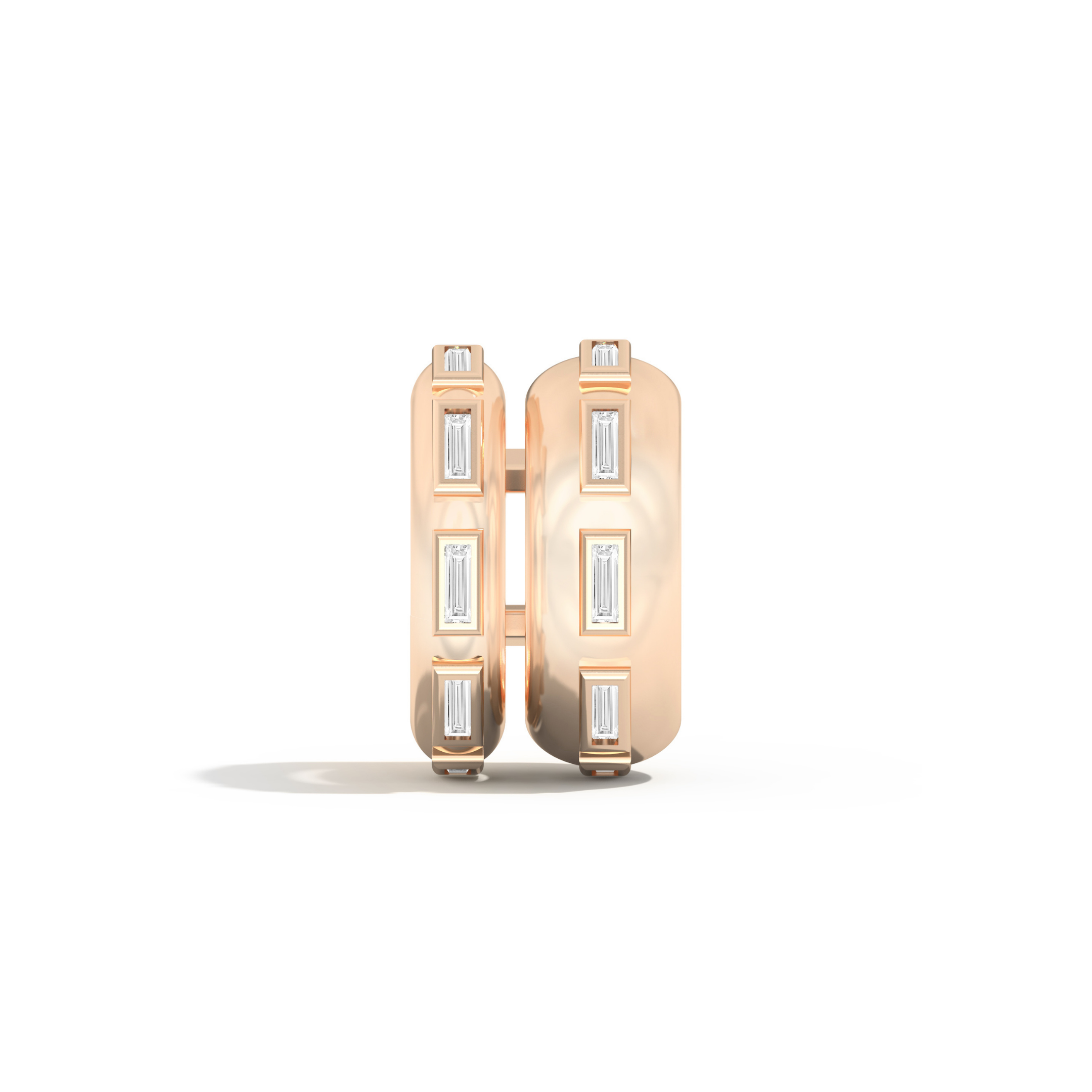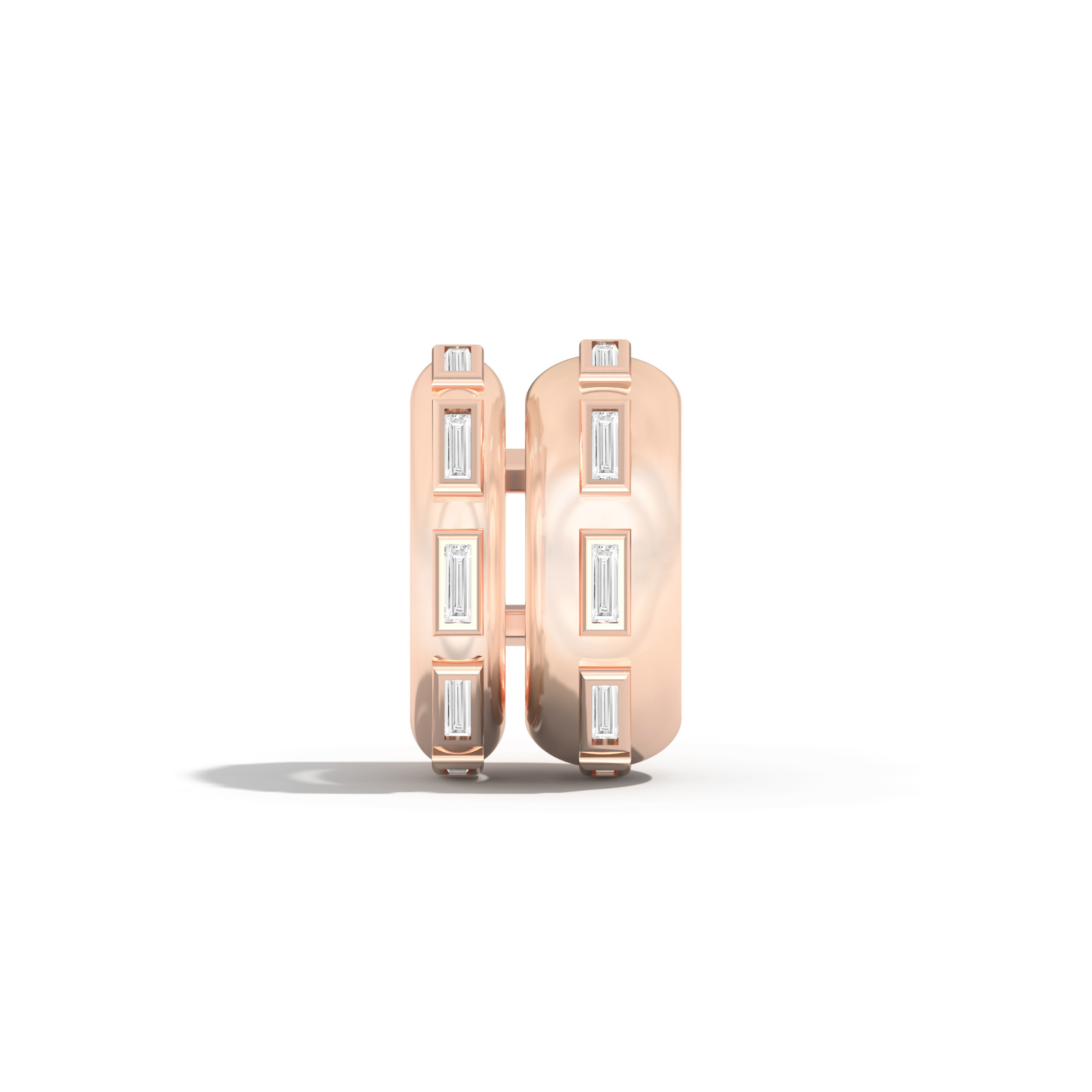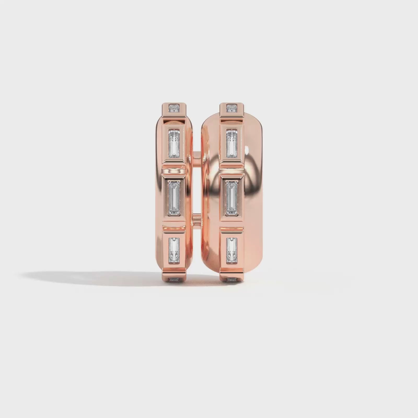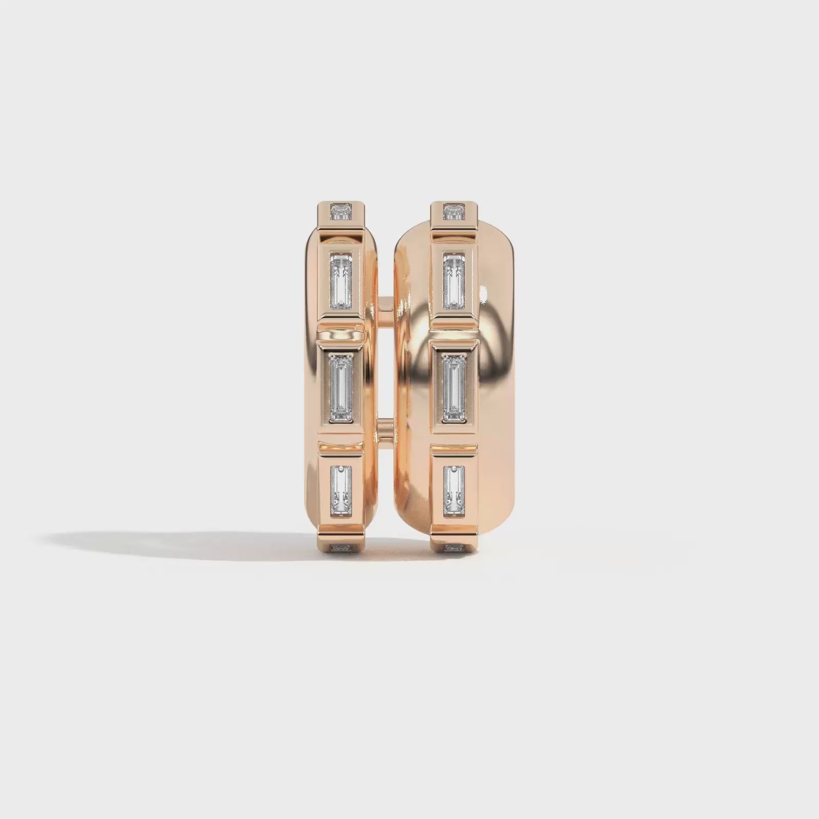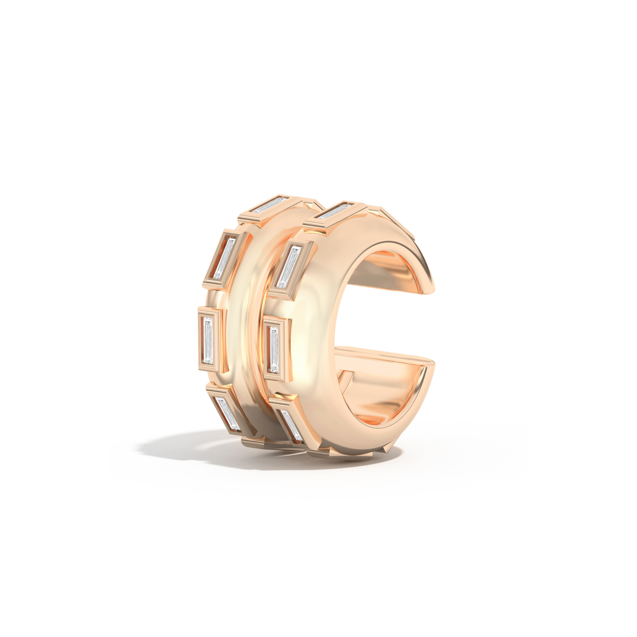 The Le Corbusier Puff Set Double Ear Cuff features two continuous lines of puff bezel-set baguette diamonds, merging modernist precision with the organic elegance of Chandigarh. Designed to give the illusion of two hoops in one, this ear cuff adds dimension to your stack without the need for piercings.