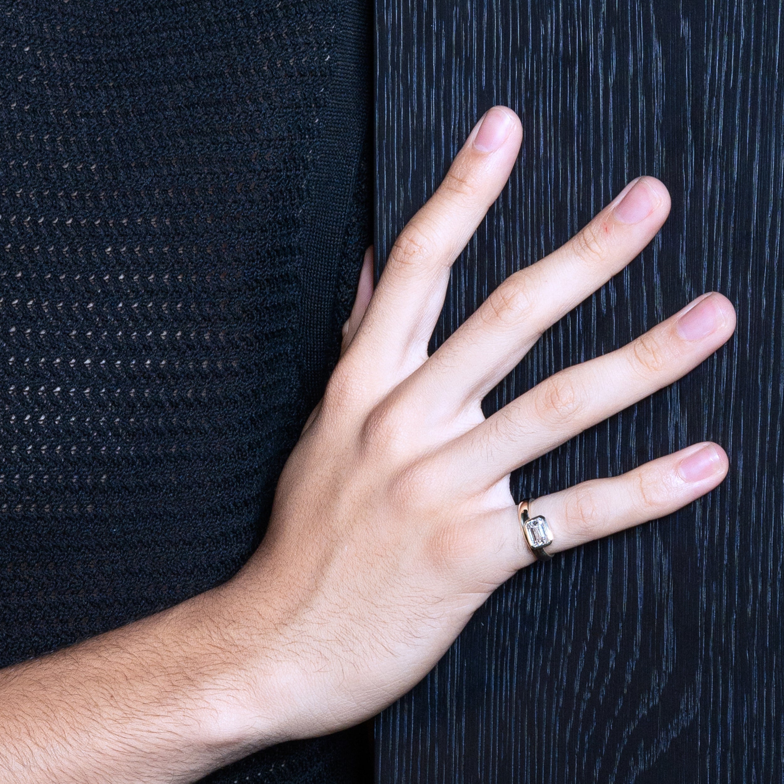 This bezel set east-west emerald-cut diamond is thoughtfully designed to rest at the edge of the finger and sparkles elegantly on our beloved 4mm donut band.