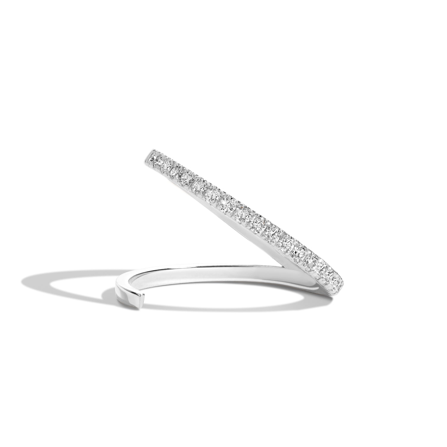 The Pavé Slant Ring is scoop-set with brilliant white diamonds. Can be worn as a wedding band, shine as an engagement ring, or everyday stacker.