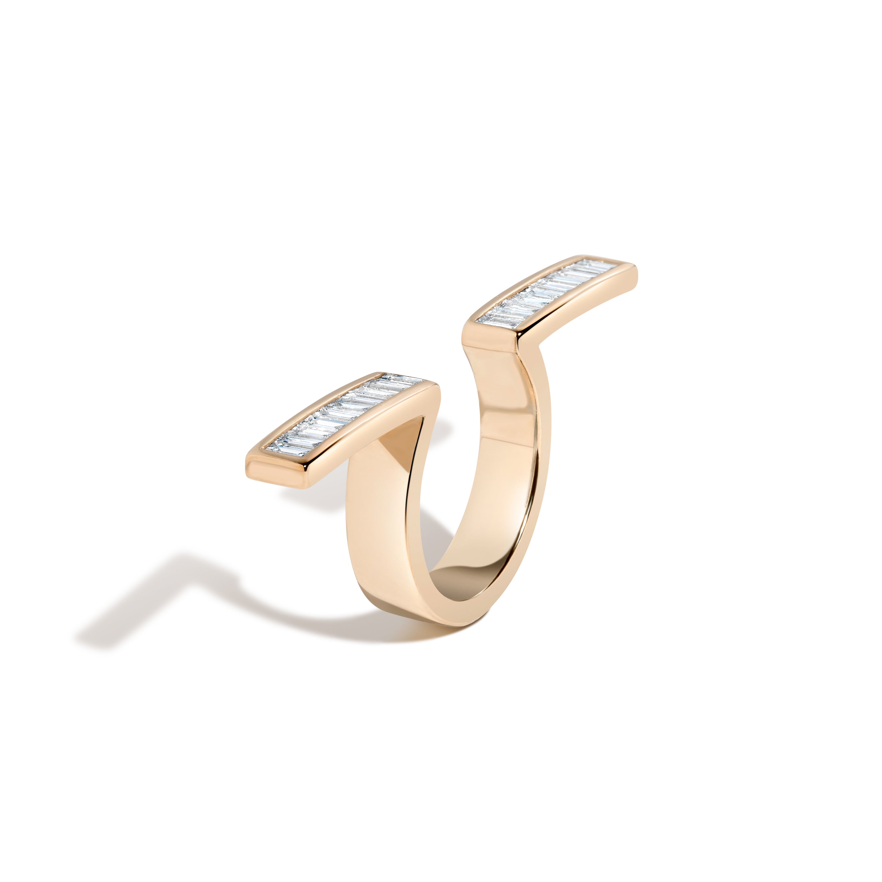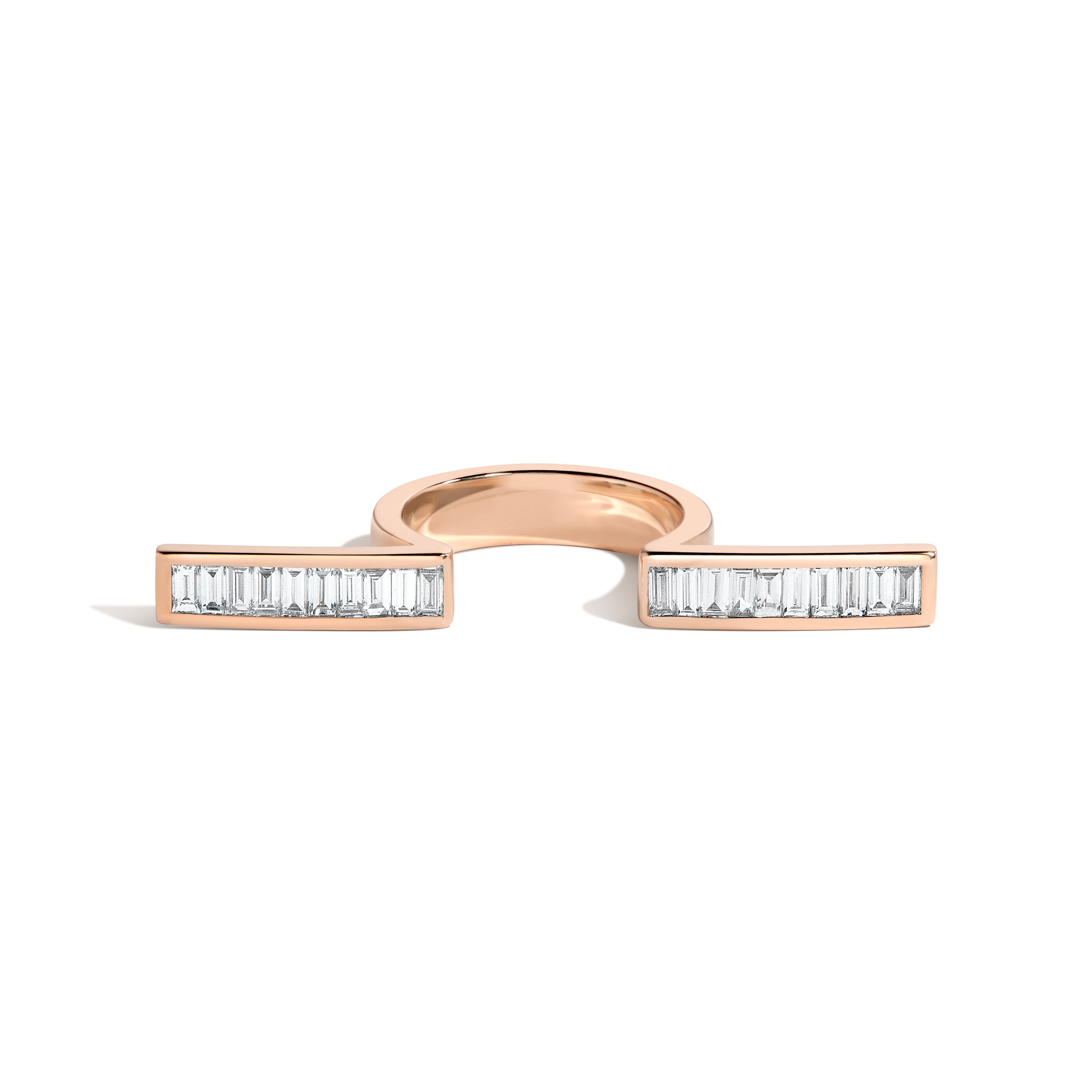 Bars are designed to comfortably extend over both adjacent fingers. Each bar features 16.5mm of channel-set baguettes.