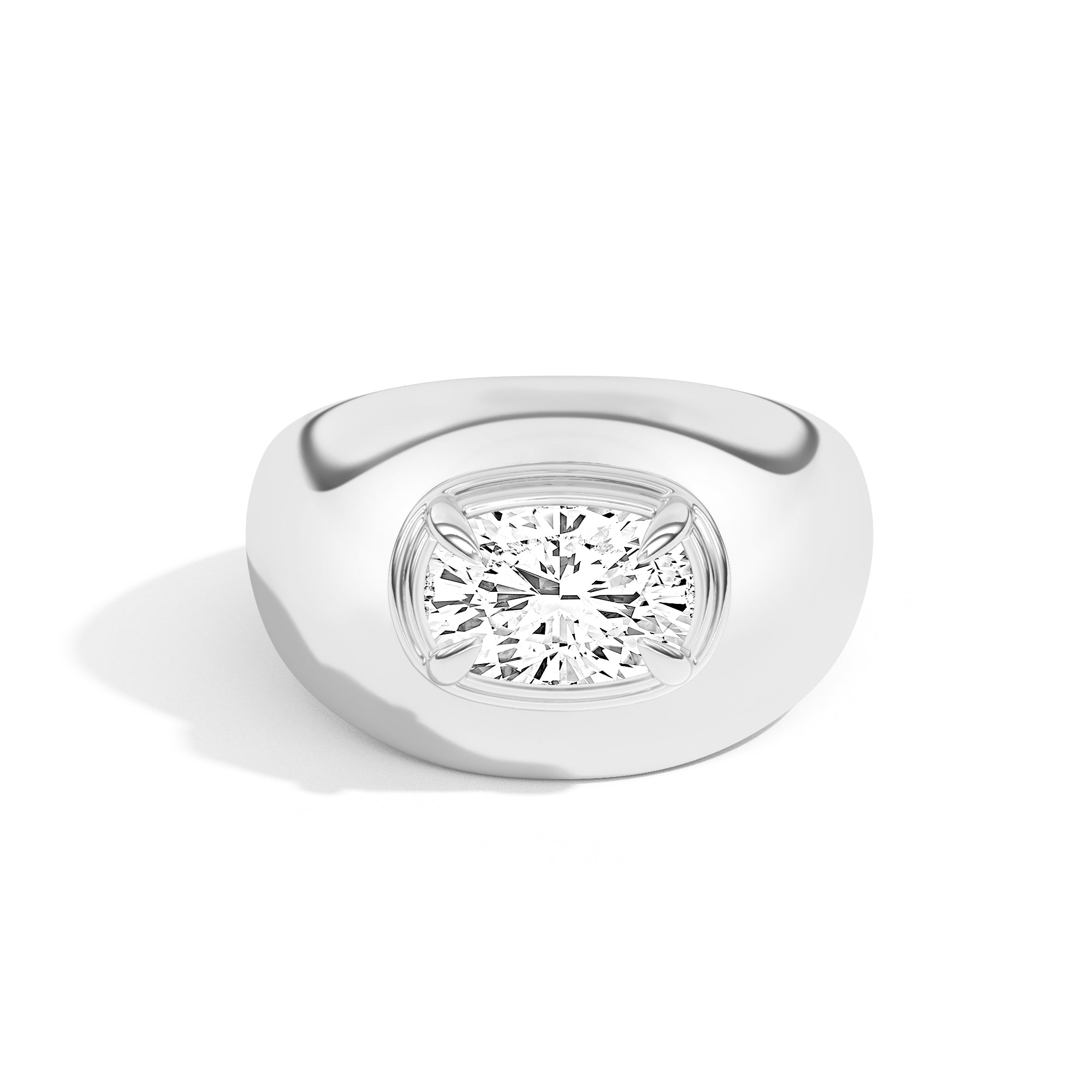 The Scarpa bombe ring, heavy on metal, makes a bold statement, evoking the reflective beauty of Venice. Each stone is set with repetition, each with two platinum bezels, finished with claw prongs to create a rhythmic layering of material, tailored to enhance the unique shape of the stone.