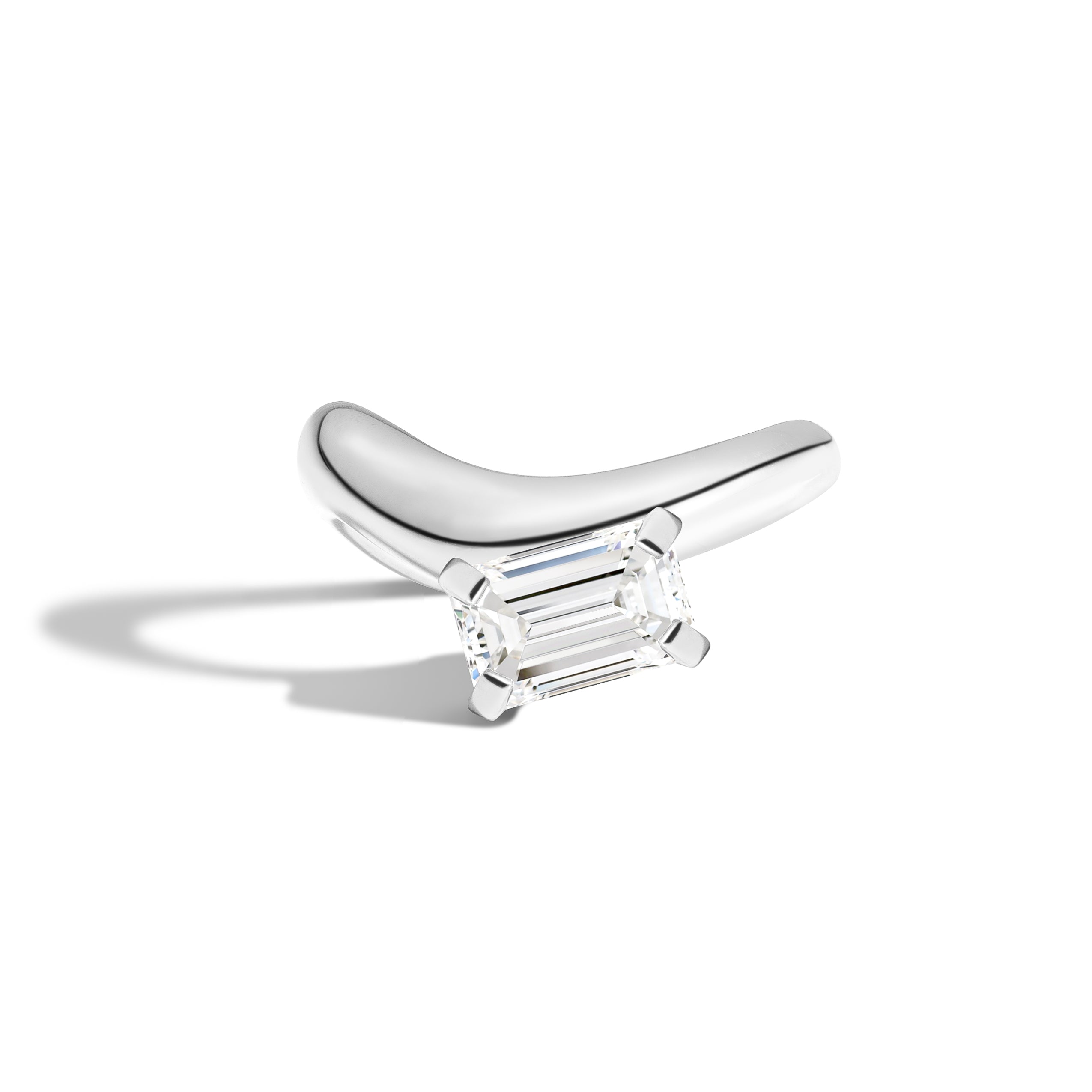 The cloud rings orchestrate a symphony of metaphysical beauty through their elegant contours and reflective surfaces, seamlessly harmonizing the worlds of art, architecture, and romance. A tab-set Emerald diamond rests cantilevered on the soft curves of a sculptural cloud band.