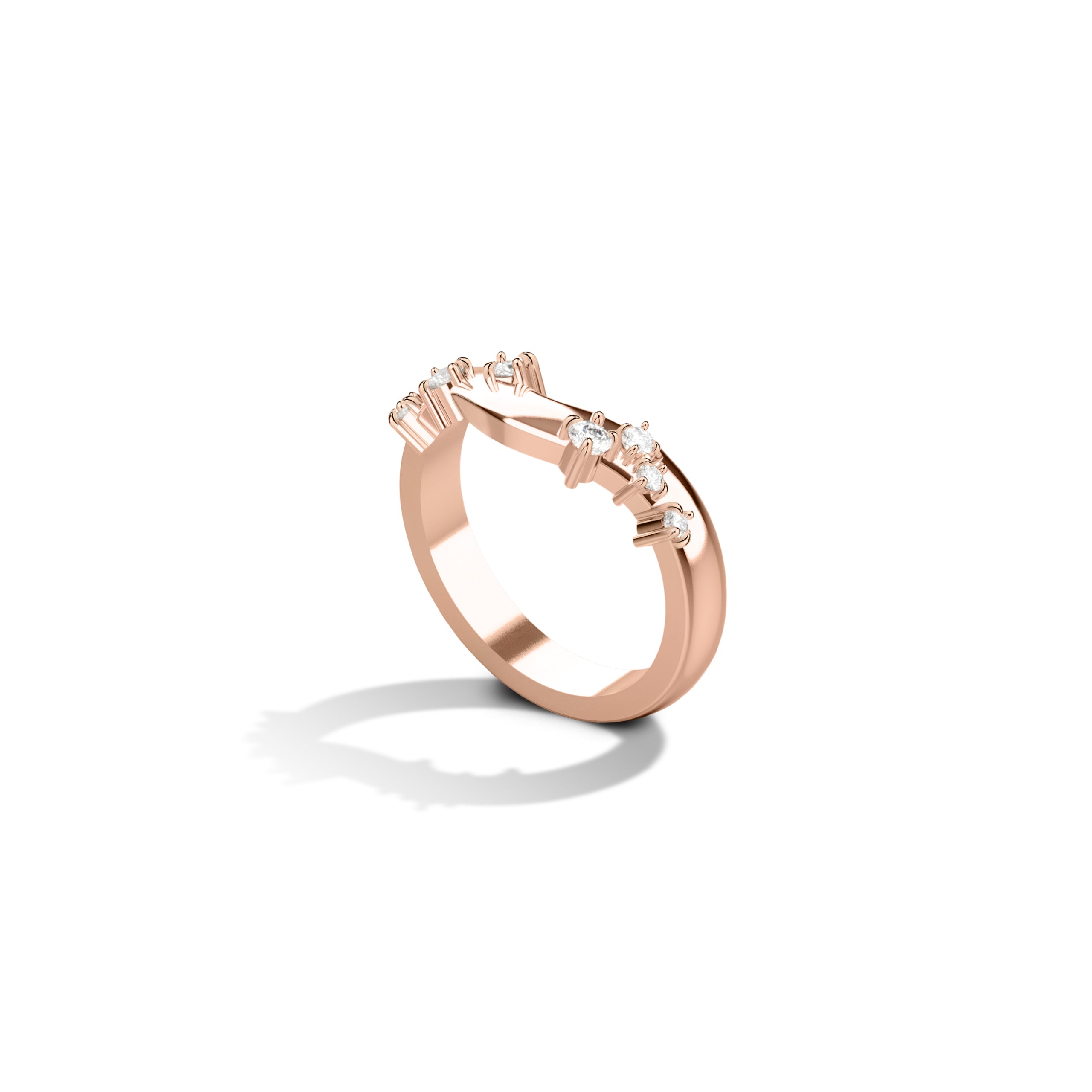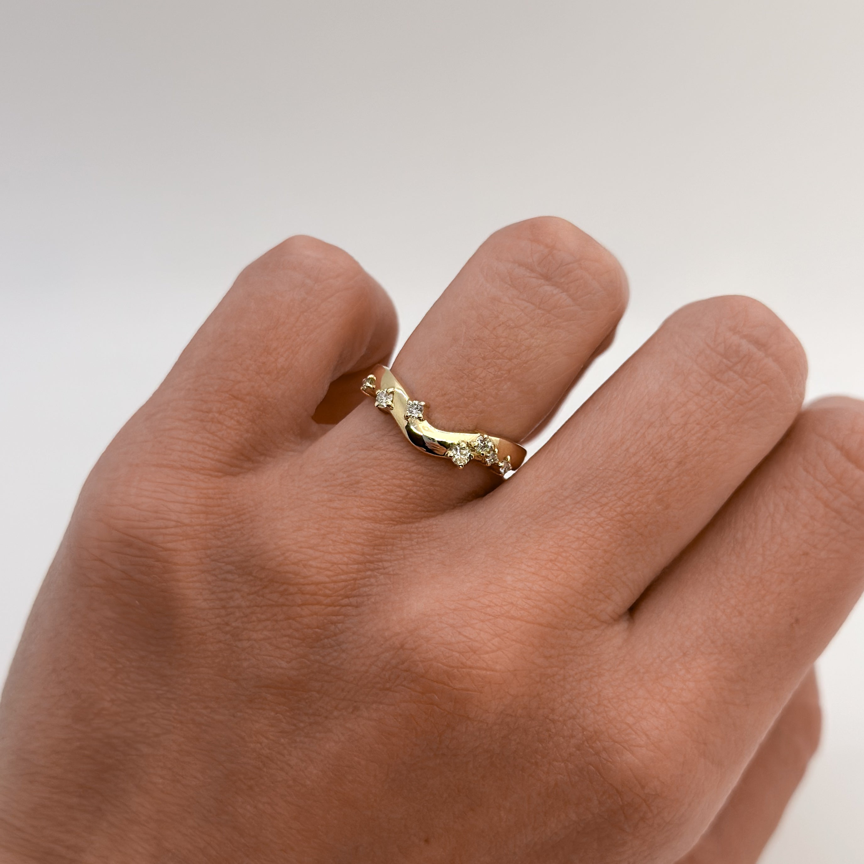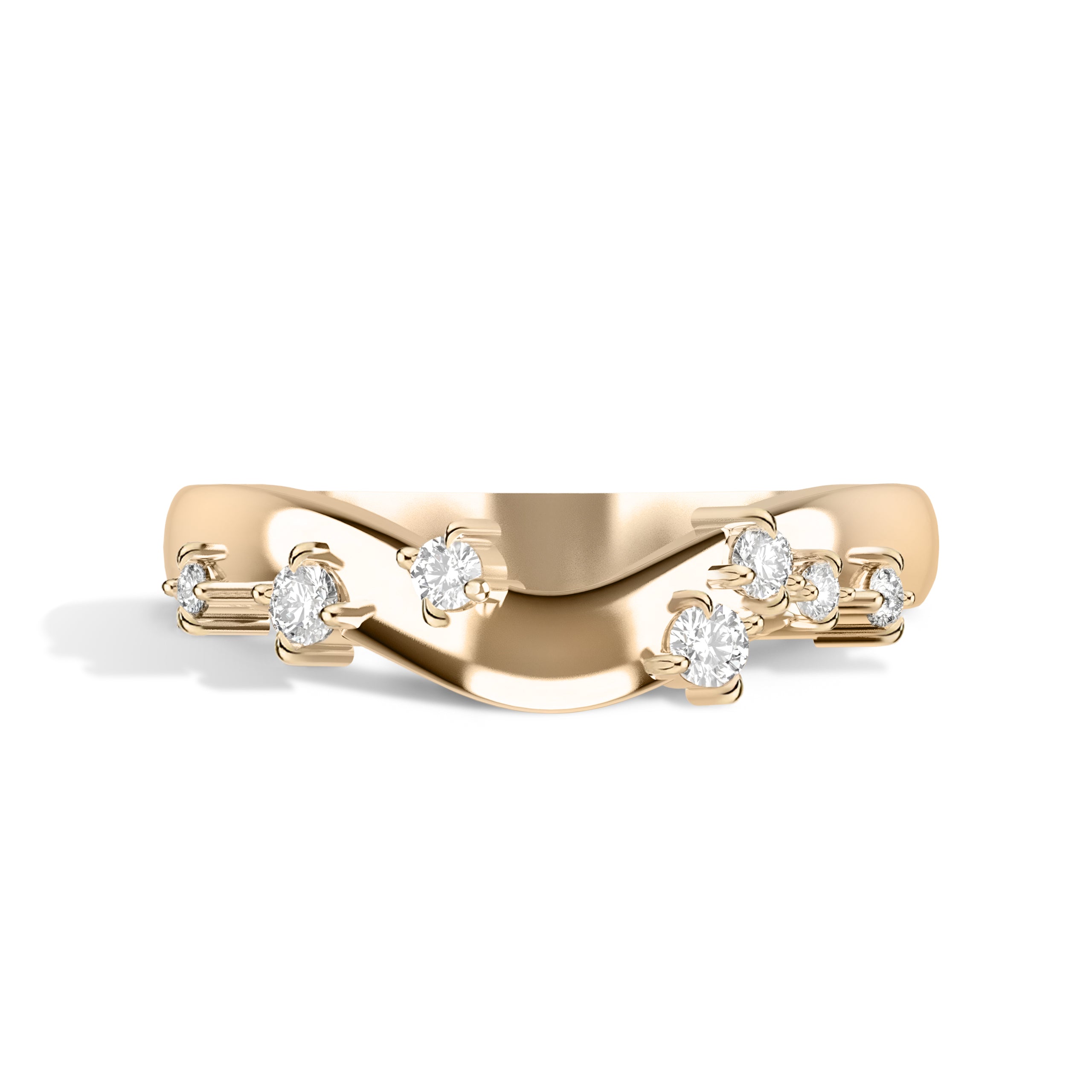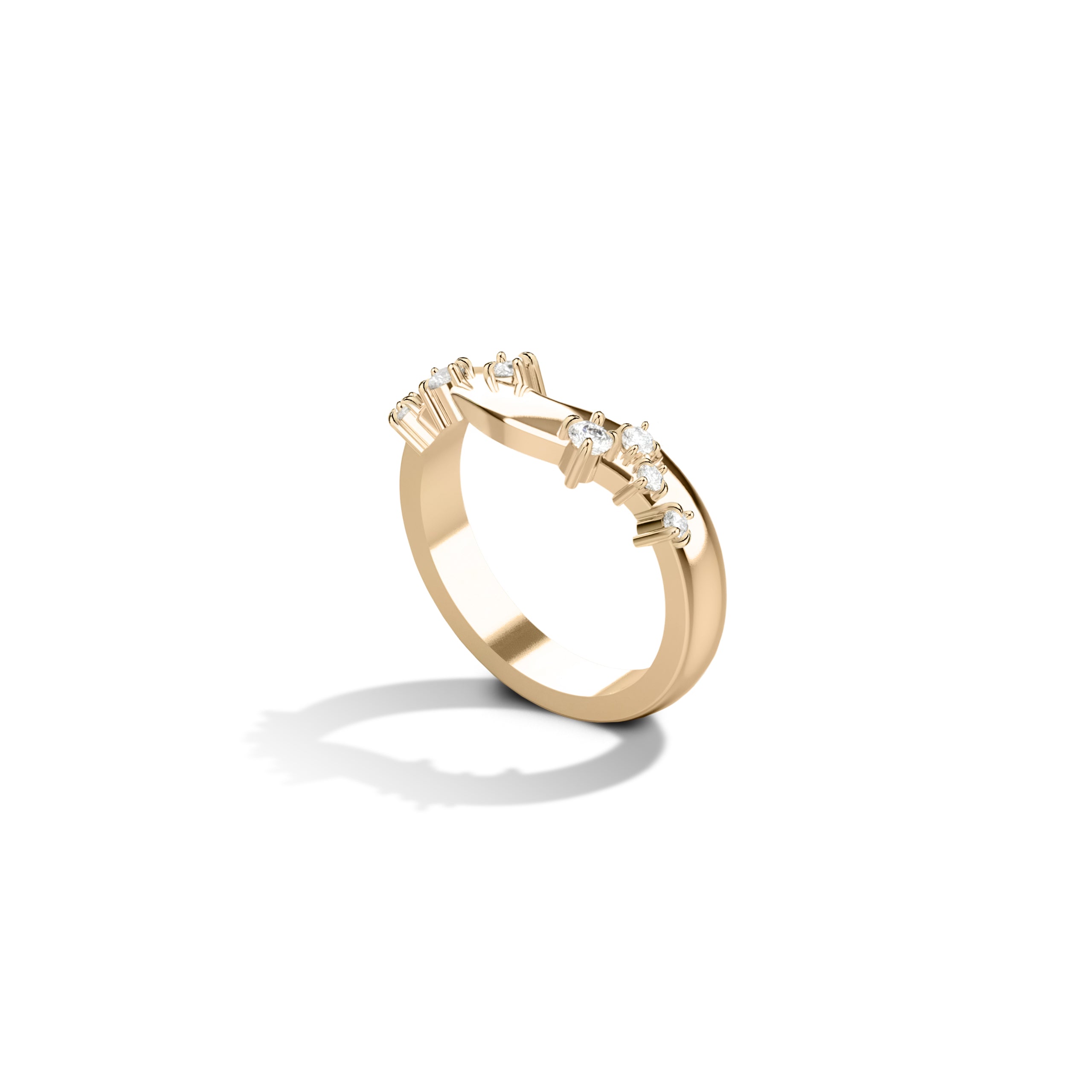 The Gaudí 3mm Curved Band takes its cues from the interior of Casa Batlló. Round diamonds in graduated sizes shimmer across a sculpted gold band, set in fine claw prongs. Like sea glass scattered by the tide, the composition is fluid, luminous, and quietly bold.