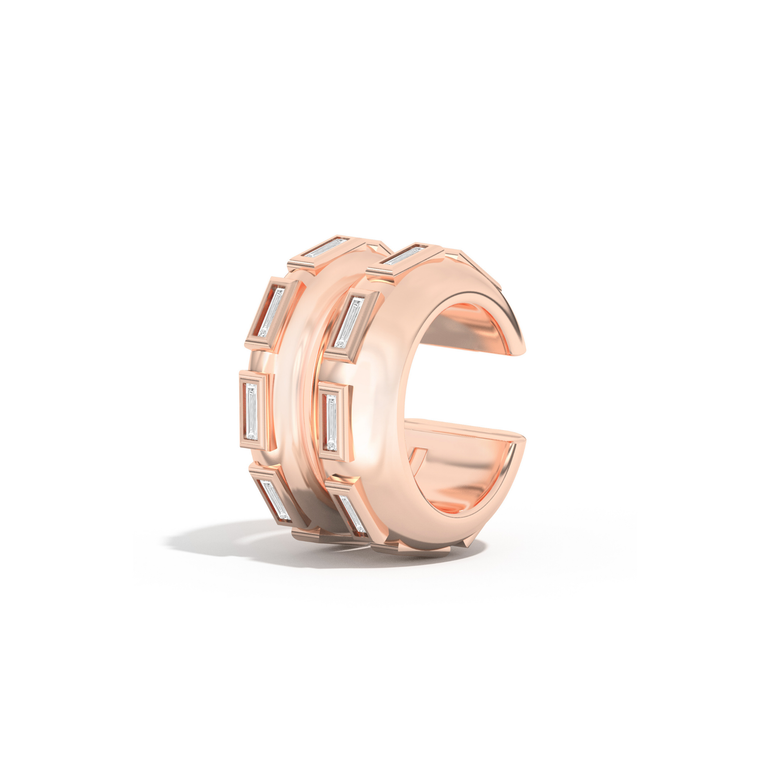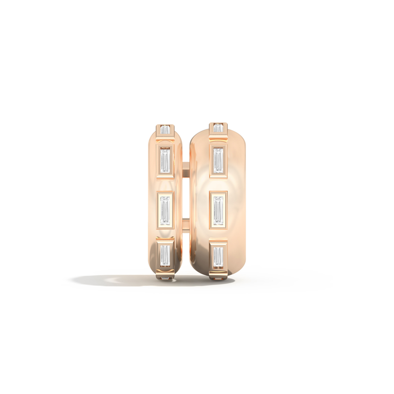 The Le Corbusier Puff Set Double Ear Cuff features two continuous lines of puff bezel-set baguette diamonds, merging modernist precision with the organic elegance of Chandigarh. Designed to give the illusion of two hoops in one, this ear cuff adds dimension to your stack without the need for piercings.