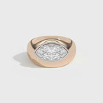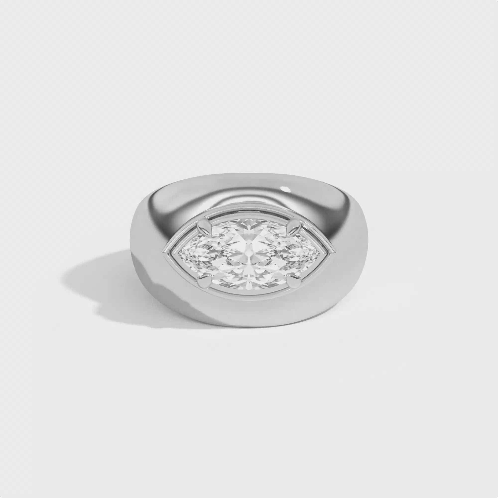 The Scarpa bombe ring, heavy on metal, makes a bold statement, evoking the reflective beauty of Venice. Each stone is set with repetition, each with two platinum bezels, finished with claw prongs to create a rhythmic layering of material, tailored to enhance the unique shape of the stone.